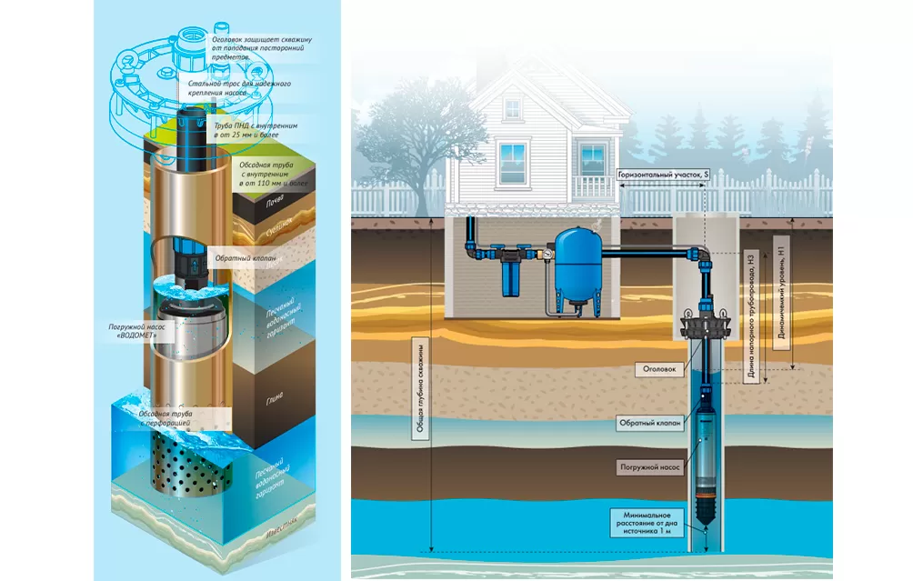 - Насос не должен находиться в скважине ниже 30 метров от зеркала воды, и должен находиться выше 1 метра от дна.