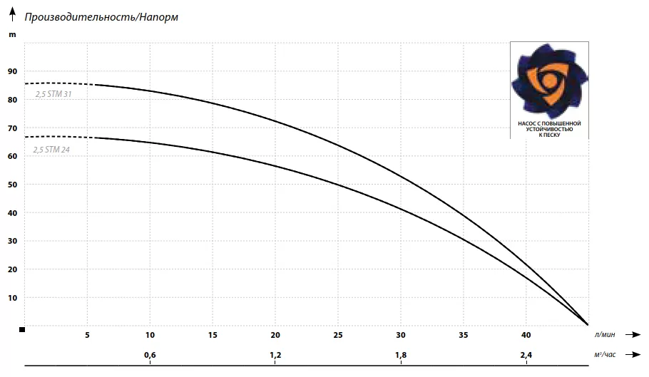Многоступенчатые скважинный насосы диаметром 66 мм с повышенной устойчивостью к песку, рассчитанные на 3 и 4–дюймовые скважины. Насос IBO 2,5STM 24 обладает повышенной эффективностью к содержанию песка в перекачиваемой жидкости. Устойчивость к песку был достигнут благодаря использованию «плавающих лопастных колес» и выбору износостойких материалов. Скважинный насос IBO 2,5STM 24 обладает отменными характеристиками для насоса с небольшим диаметром. Максимальный напор насоса ИБО составляет 66 м, при этом максимальная производительность в пиковой точки показывает 2.7 м³/час. При таких напорно-расходных характеристиках мощность двигателя составляет всего 370 Вт. Конденсатор насоса встроен в двигатель, благодаря чему электрическая установка намного проще, чем в случае насосов со стартовой коробкой. Насос оснащен тепловой защитой, установленной в обмотке двигателя. Насос комплектуется кабелем 1 м. Основным преимуществом насоса IBO 2,5STM 24 является чрезвычайно высокая производительность для насоса диаметром 66 мм со скоростью до 2.7 м³/час.