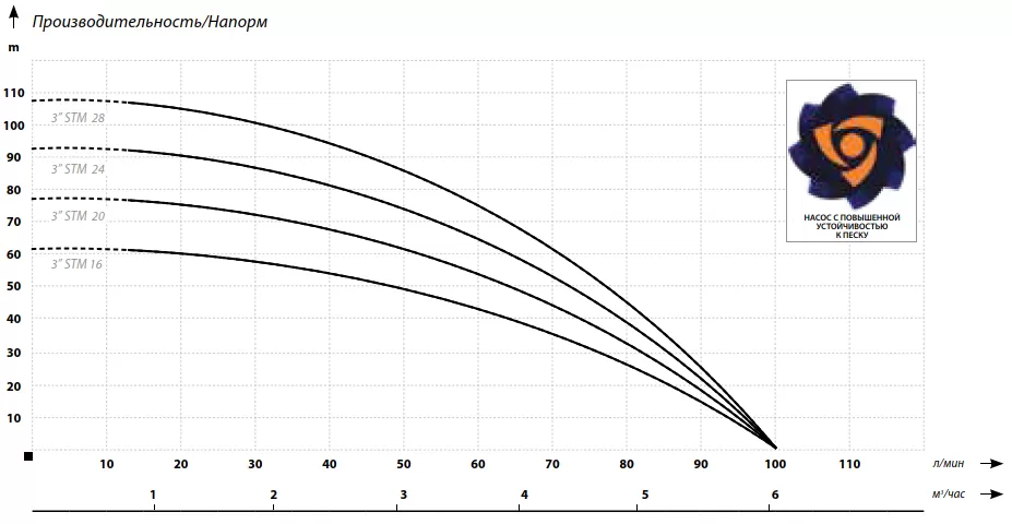 Многоступенчатые скважинный насосы диаметром 75 мм с повышенной устойчивостью к песку, рассчитанные на 3 и 4–дюймовые скважины. Насос IBO 3STM 28 кабель 20 метров обладает повышенной эффективностью к содержанию песка в перекачиваемой жидкости. Устойчивость к песку был достигнут благодаря использованию «плавающих лопастных колес» и выбору износостойких материалов. Скважинный насос IBO 3STM 28 кабель 20 метров обладает отменными характеристиками для насоса с небольшим диаметром. Максимальный напор насоса ИБО составляет 108 м, при этом максимальная производительность в пиковой точки показывает 6 м³/час. При таких напорно-расходных характеристиках мощность двигателя составляет всего 1500 Вт. Конденсатор насоса встроен в двигатель, благодаря чему электрическая установка намного проще, чем в случае насосов со стартовой коробкой. Насос оснащен тепловой защитой, установленной в обмотке двигателя. Насос комплектуется кабелем 20 м. Основным преимуществом насоса IBO 3STM 28 кабель 20 метров является чрезвычайно высокая производительность для насоса диаметром 75 мм со скоростью до 6 м³/час.