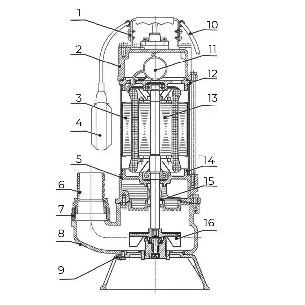 Основным элементом насоса является рабочее колесо, закрепленное на конце вала электродвигателя. Во время работы насоса, жидкость подается в насосную часть через всасывающие отверстия на дне. Для предотвращения блокирования рабочего колеса волокнистыми включениями, вал двигателя оснащен вращающимся ножом, который их измельчает.