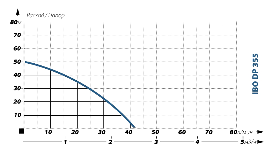 Насосная станция IBO DP 355 24л на базе мембранного бака 24 л – это одноступенчатый, самовсасывающий, центробежный поверхностный насос, оснащенный системой, которая увеличивает мощность всасывания благодаря использованию трубки Вентури помещенной непосредственно в скважину. Насосная станция IBO DP 355 24л одна из немногих, обладающий мощностью всасывания до 23 м при использовании системы выносного инжектора, помещенного в скважину или колодец. Благодаря высоким параметрам всасывания насос может заменить глубинный насос. Корпус насоса выполнен из прочного чугуна, а двигатель насоса оснащен тепловой защитой. Насос имеет шнур питания с вилкой длинной 0.5 м. Подымая воду с глубины до 23 метров IBO DP 355 24л обладает отличными напорно-расходными характеристиками. Насос выдает максимальный напор в 50 м и максимальную производительностью в 2.52 м³/час, при таких характеристика мощность электродвигателя составляет всего 750 Вт. Насосная станция состоит из поверхностного насоса, механического реле, мембранного бака, гибкой подводки и манометром. Зоводские настройки на реле выставлены: включение насоса 1,4 атм / отключение насосной станции при 2,8 атм.