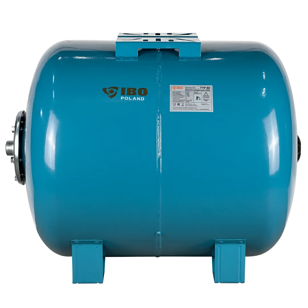 Горизонтальный мембранный бак для воды IBO объемом 80 литров. Бак выполнен из стали и покрыт специальным антикоррозионным составом. Мембрана бака выполнена из пищевой резины на основе бутилкаучука. Бак снабжен приварной площадкой для установки поверхностного насоса. В нижней части бака установлены металлические кронштейны с целью крепления бака к поверхности.