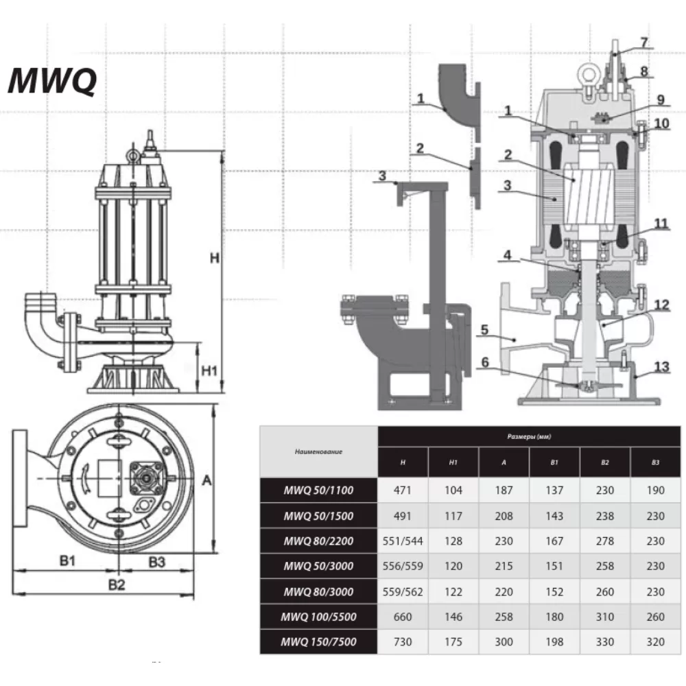 Серия профессиональных погружных насосов, оснащенных системой смешивания, предназначенных для клиентов, которым требуется мощный и солидный продукт в их профессиональной деятельности. Эти насосы успешно используются в канализационных насосных станциях. Насосы MWQ предназначены для перекачки неочищенных сточных вод с насосных станций, в которых могут оседать плотные осадки. Насосы имеют специальное дополнительное внешнее лопастное колесо (агитатор) для смешивания и разрушения тяжелых отложений. Насос изготовлен из материалов, гарантирующих длительную и надежную эксплуатацию. Вал двигателя изготовлен из нержавеющей стали. Камера насоса герметизирована двойным механическим сальником SiC/ SiC. В насосе применен многоканальное лопастное колесо для загрязнений большого диаметра. Все насосы серии MWQ приспособлены для монтажа с опорным коленом. Двигатели имеют изоляцию обмотки класса F и дополнительно однофазные версии оснащены термической защитой в обмотке. Насосы оснащены подшипниками японского производства марки NSK. Фланцы приспособлены для подключения труб или быстрых соединений. Насосы доступны в однофазной версии 230 В ~/ 50 Гц с поплавковым выключателем, а также в трехфазной 400 В ~ 3 / 50 Гц. Насосы могут поставляться с автоматической трубной муфтой, позволяющими монтировать их в насосных станциях. Опорное колено является отдельным товаром.
