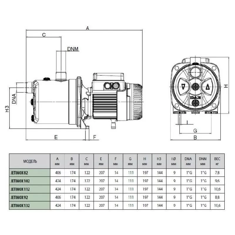 Поверхностный насос DAB JETINOX 112 T - самовсасывающий центробежный насос с отличной всасывающей способностью даже при наличии пузырьков воздуха. Особенно подходит для водоснабжения в бытовых установках, малом сельском хозяйстве, садоводстве и в случаях необходимости самовсасывания. Jetinox: корпус насоса – нержавеющая сталь. Опора двигателя – чугун, рабочее колесо, диффузор, трубка Вентури и защита от песка – технополимер.