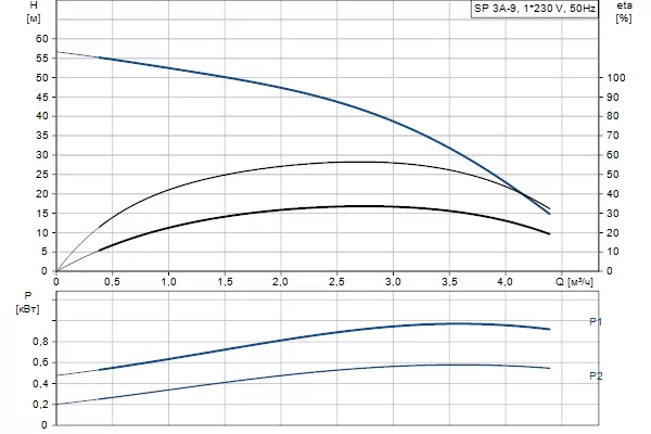 Насос Grundfos SP 3A-9 создан с применением новейших гидравлических технологий. Grundfos SP 3A-9 созданные специально для того, чтобы обеспечивать максимальную эффективность в периоды высокой нагрузки, насос имеет низкую стоимость и высокую надёжность эксплуатации вне зависимости от вида назначения. Grundfos SP 3A-9 обеспечивает высокую эффективность, высокое сопротивление абразивному износу (песку и иным абразивам), защиту от перегрева двигателя и простоту технического обслуживания. Также доступна готовая к применению система контроля и управления, предназначенная для постоянной оптимизации работы насосной системы. Максимальная производительность насоса 4.3 м3/час, максимальный напор 55 м при мощности электродвигателя 550 Вт. Насос работает от сети 220 в. Гарантийный срок на насос Grundfos SP 3A-9 составляет 2 года.