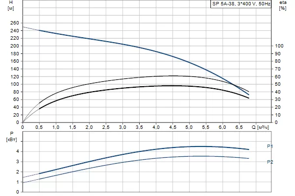 Насос Grundfos SP 5A-38 создан с применением новейших гидравлических технологий. Grundfos SP 5A-38 созданные специально для того, чтобы обеспечивать максимальную эффективность в периоды высокой нагрузки, насос имеет низкую стоимость и высокую надёжность эксплуатации вне зависимости от вида назначения. Grundfos SP 5A-38 обеспечивает высокую эффективность, высокое сопротивление абразивному износу (песку и иным абразивам), защиту от перегрева двигателя и простоту технического обслуживания. Также доступна готовая к применению система контроля и управления, предназначенная для постоянной оптимизации работы насосной системы. Максимальная производительность насоса 7 м3/час, максимальный напор 250 м при мощности электродвигателя 4000 Вт. Насос работает от сети 380 в. Гарантийный срок на насос Grundfos SP 5A-38 составляет 2 года.