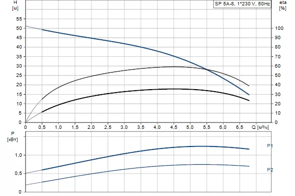 Насос Grundfos SP 5A-8 создан с применением новейших гидравлических технологий. Grundfos SP 5A-8 созданные специально для того, чтобы обеспечивать максимальную эффективность в периоды высокой нагрузки, насос имеет низкую стоимость и высокую надёжность эксплуатации вне зависимости от вида назначения. Grundfos SP 5A-8 обеспечивает высокую эффективность, высокое сопротивление абразивному износу (песку и иным абразивам), защиту от перегрева двигателя и простоту технического обслуживания. Также доступна готовая к применению система контроля и управления, предназначенная для постоянной оптимизации работы насосной системы. Максимальная производительность насоса 7 м3/час, максимальный напор 50 м при мощности электродвигателя 750 Вт. Насос работает от сети 220 в. Гарантийный срок на насос Grundfos SP 5A-8 составляет 2 года.